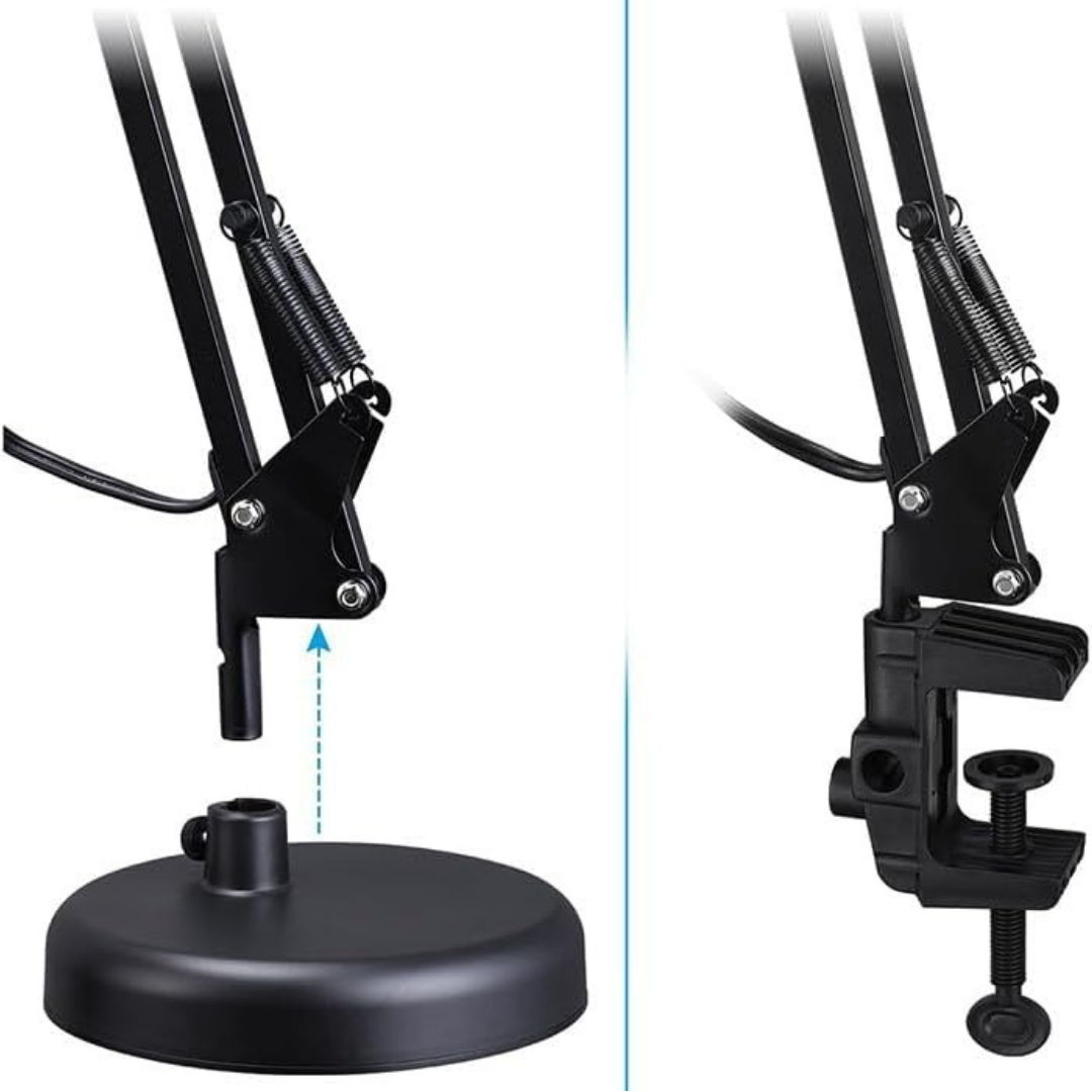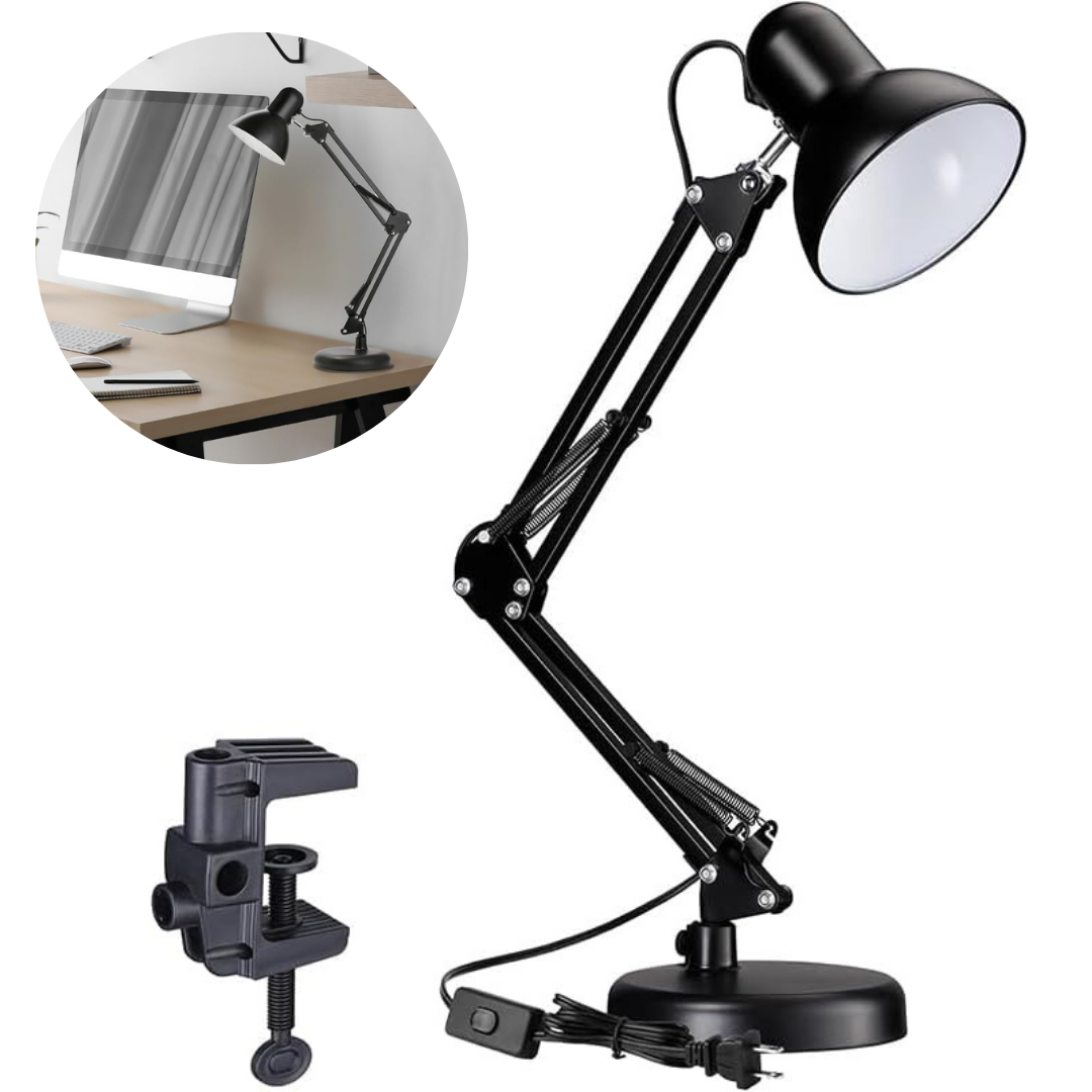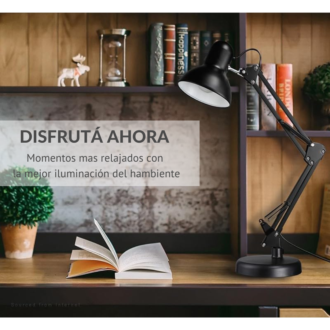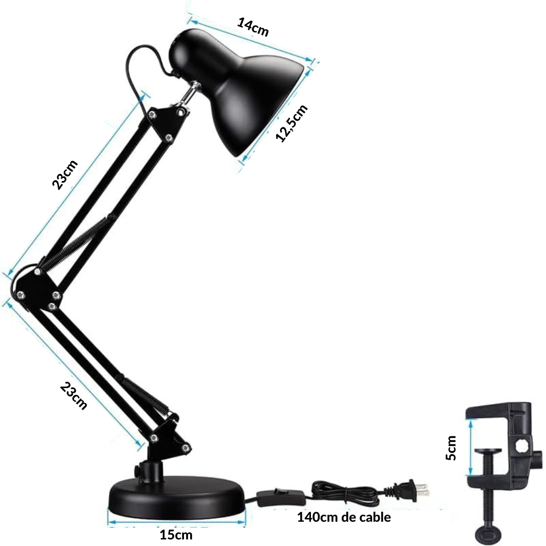 Lámpara De Escritorio Trafolec Articulada Doble Función Mesa + Morsa | Velador E27 110/220V Iluminá tu espacio de trabajo con la Lámpara de Escritorio Trafolec articulada, ideal para escritorio, estudio, oficina, lectura y tareas de precisión como dibujo técnico, costura, taller y manicura. Su diseño doble función te permite usarla apoyada sobre mesa o fijarla con agarre tipo morsa/pinza a un borde firme, logrando una posición estable y ahorrando espacio. Gracias a su brazo ajustable y rotativo, podés orientar la luz exactamente donde la necesitás. Cuenta con estructura metálica y pantalla de aluminio, pensada para un uso diario resistente y cómodo. Utiliza portalámparas E27 (no incluye foco), compatible con lámparas LED o tradicionales. Excelente opción si buscás velador de escritorio, lámpara de mesa, lámpara articulada, lámpara con morsa, lámpara con pinza, lámpara para estudio, lámpara para dibujo, luz de escritorio, lámpara para lectura, lámpara para taller, lámpara para manicura. Beneficios principales Doble función: base para mesa + agarre con morsa/pinza. Brazo articulado ajustable y rotativo: orientá la luz con precisión. Estructura de metal: firmeza y durabilidad. Pantalla de aluminio: mejor dirección del haz de luz. Interruptor integrado: encendido/apagado práctico. Ideal para escritorio, estudio, oficina, lectura, dibujo técnico, costura, taller y estética. Cómo se usa / para qué sirve Colocala sobre la mesa o sujetala con la morsa a un borde firme. Instalá un foco E27 (recomendado LED para mayor eficiencia) y ajustá el brazo para iluminar tu zona de trabajo. Usos ideales Escritorio y oficina Estudio y lectura Dibujo técnico y arquitectura Taller, banco de trabajo y reparaciones Costura, manualidades y armado Manicura y estética (tareas de detalle) Aclaraciones importantes No incluye foco. Imágenes a modo ilustrativo. Recomendada para uso interior. Especificaciones técnicas Marca: Trafolec Modelo: Trafolec Tipo: Lámpara de escritorio / Velador / Lámpara de mesa Portalámparas: E27 Alimentación: 110/220V Frecuencia: 50/60 Hz Potencia máxima: 20 W Material de la estructura: Metal Material de la pantalla: Aluminio Largo de cable: 1 metro Dimensiones aproximadas: Alto 50 cm | Diámetro 15 cm | Ancho 15 cm Colores (según variante): Blanco / Negro
